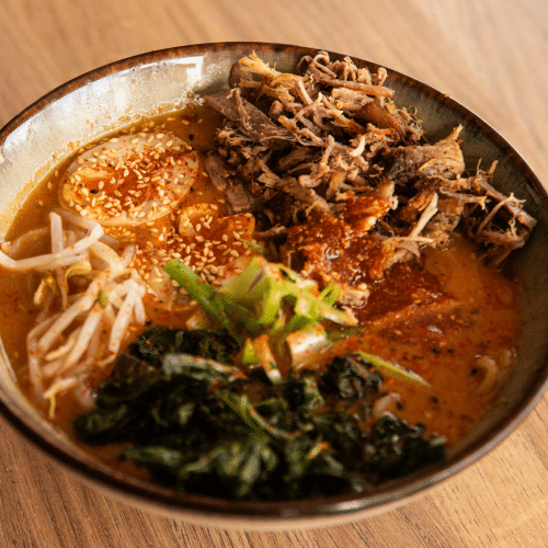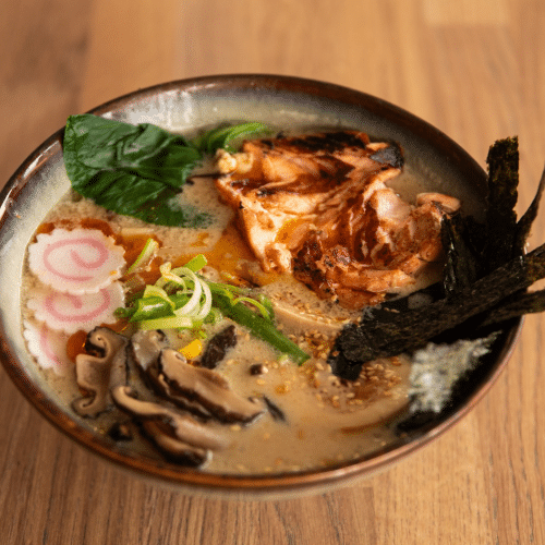 wywar na bazie warzyw, tare miso, pak choi, narutomaki, grzyby shitake, marynowane jajko, dymka, shichimi togarashi, nori, olej smakowy chilli